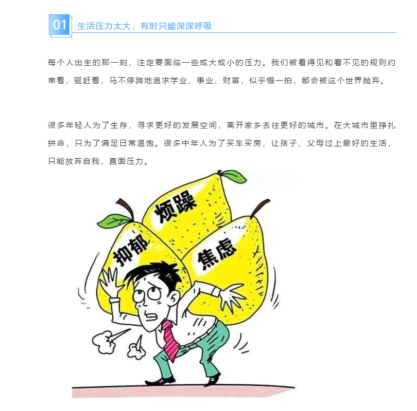 生活的壓力,需要一個(gè)宣泄口:或是深夜點(diǎn)上一支煙;或是球場(chǎng)揮汗如雨;或許關(guān)上門(mén)默默流淚……更多的時(shí)候,是低下頭,深呼吸,告訴自己你能行,請(qǐng)堅(jiān)持。