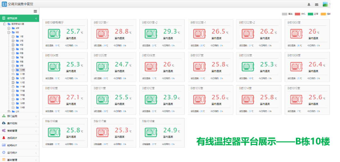1、ABCD及E座空調系統統一集成,在綜合能源管理平臺中可集中查看并控制每個房間的空調使用情況及策略。