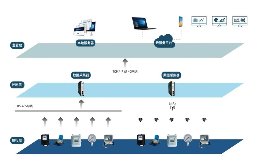 通過 RS-485 總線或 LoRa 通訊模塊,將計量表具的數據收集到智能網關,在施工布線困難的情況下,采用 LoRa 無線通訊模塊,免去復雜的施工布線,將計量表具的數據簡單有效地傳輸到智能網關。