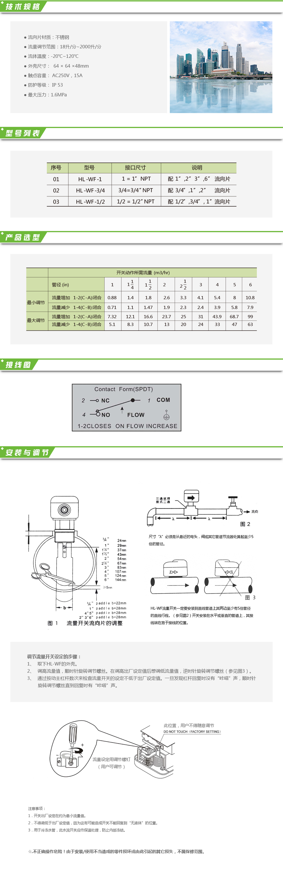 HL-WF系列液體流量開關用于測量流經管道的液體流動狀態,例如:水、乙烯、乙二醇或任何對黃銅、不銹鋼無腐蝕作用及未被定為危險液體的流體,其典型應用是使用在需要有連鎖作用或“斷流”保護的場所。