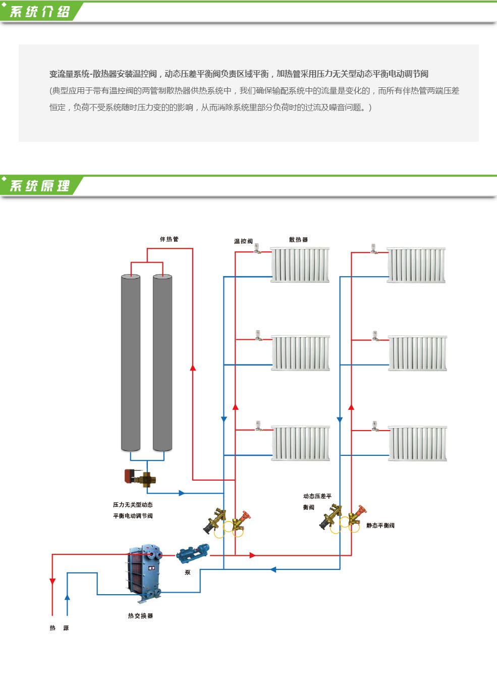 散熱器安裝溫控閥,動態(tài)壓差平衡閥負責(zé)區(qū)域平衡,加熱管采用壓力無關(guān)型動態(tài)平衡電動調(diào)節(jié)閥